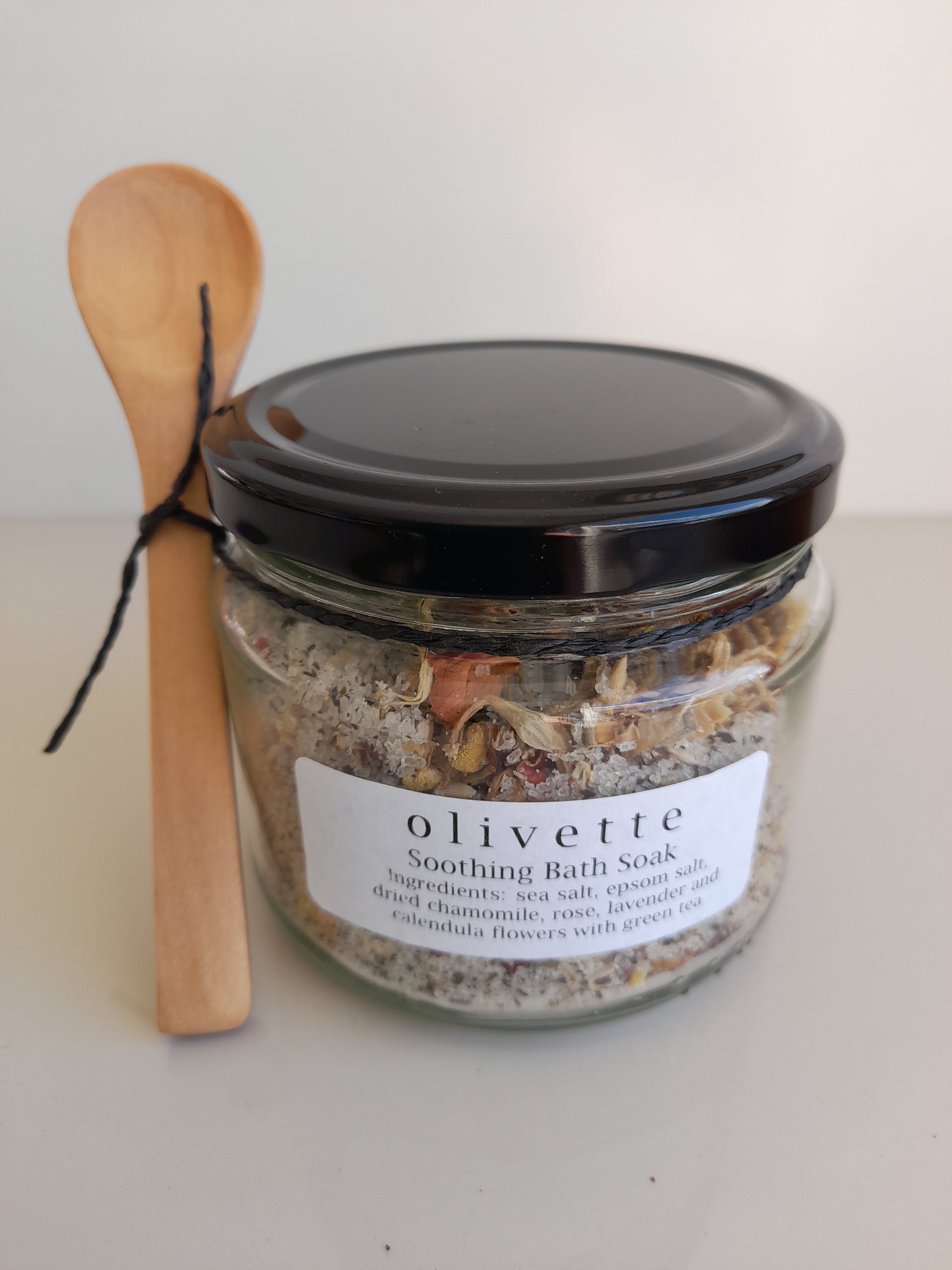 Ingredients include sea salt, epsom salt, dried flowers - lavender, rose petals, chamomile flowers, calendula flowers, rosemary with green tea.